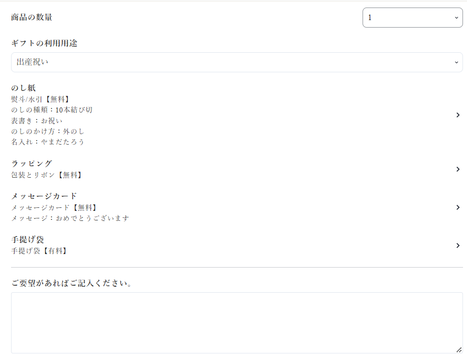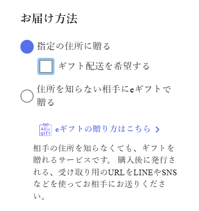 個別の商品ページにて、「お届け方法」をチェックいただくとギフトオプションが表示されます。